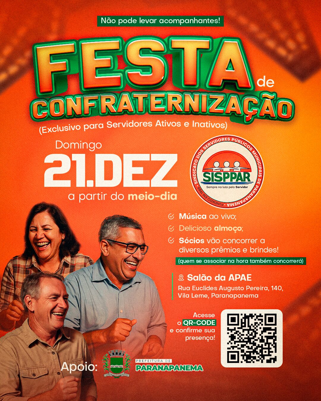 O Sindicato dos Servidores Públicos Municipais de Paranapanema (SISPPAR) promove, 21 de dezembro, a partir do meio-dia, a tradicional Festa de Confraternização dos Servidores, no Salão da APAE. O evento, exclusivo para Servidores ativos e inativos, marca o encerramento das atividades do ano e reforça o compromisso do Sindicato com o bem-estar, a integração e o reconhecimento daqueles que fazem o serviço público acontecer no município.